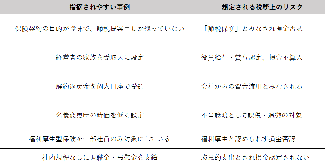 特に、契約目的・受取人設定・会計処理などに不備があると、「節税目的」と判断され、損金否認や追徴課税に発展することがあります。